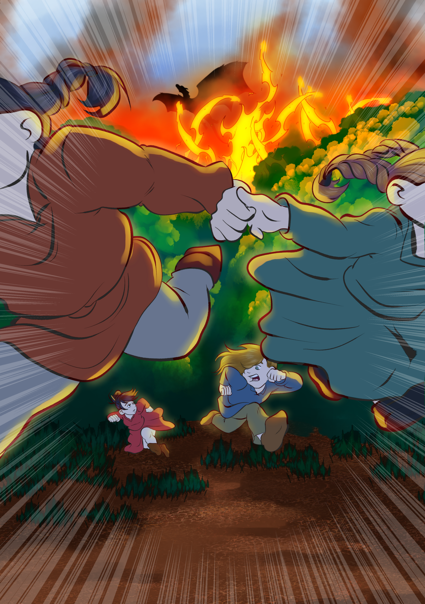 Et brøl og en kæmpe flamme væltede ind over træerne og fandt vej ned mod skovbunden, tæt på hvor de var kommet fra. Ilden sved med det samme bladene og stammerne sorte.